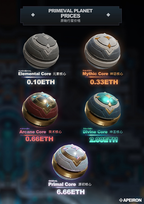 本次预售的行星核心NFT总共只会铸造4586个,每种行星核心都会有专属的”开端”标识,永久地突显它是Apeiron神域中最早出现的行星之一。拥有行星核心的玩家,可以参与后续的OG空投活动、生命起源活动(Abiogenesis Event)、原始天合活动(Primeval Celestial Conjunction)以及Beta测试。
