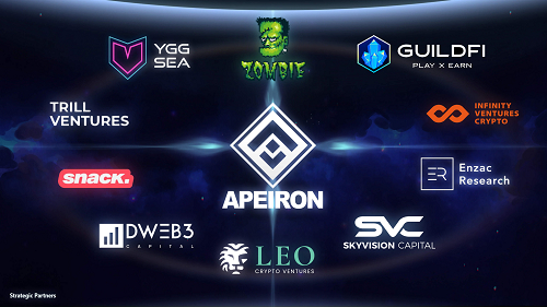Apeiron在种子轮已获得800万美金的投资,战略合作伙伴包括了余文乐的NFT项目Zombie club、全球最大游戏公会YGG的东南亚分部YGGSEA、今年2月刚获得由币安智能链(BSC)设立 10 亿美元增长基金投资的游戏公会GuildFi,以及Web3 领域的资深团队Enzac Research 和 Skyvision Capital等。