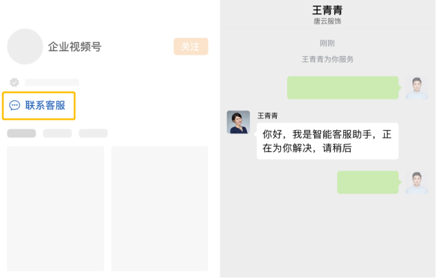 举个例子:如果没有新微信客服,用户在看完企业视频号的产品营销或宣传视频后,如果用户产生意向,想进一步联系该企业了解产品,将会很麻烦。需要再通过其它渠道找到该企业的联系方式,再进行联系,而企业往往部门众多,还不一定能找到对口的联系人。如此一折腾,怕是用户早就丧失了了解的兴趣。