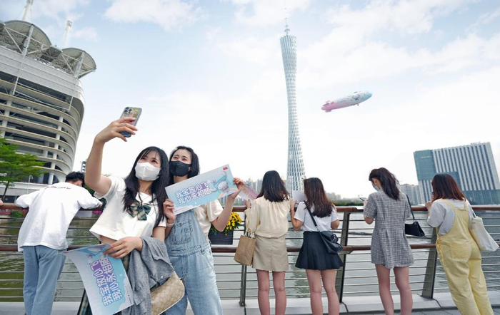 飞艇现身广州小蛮腰上空,名创优品将大耳狗宠上天