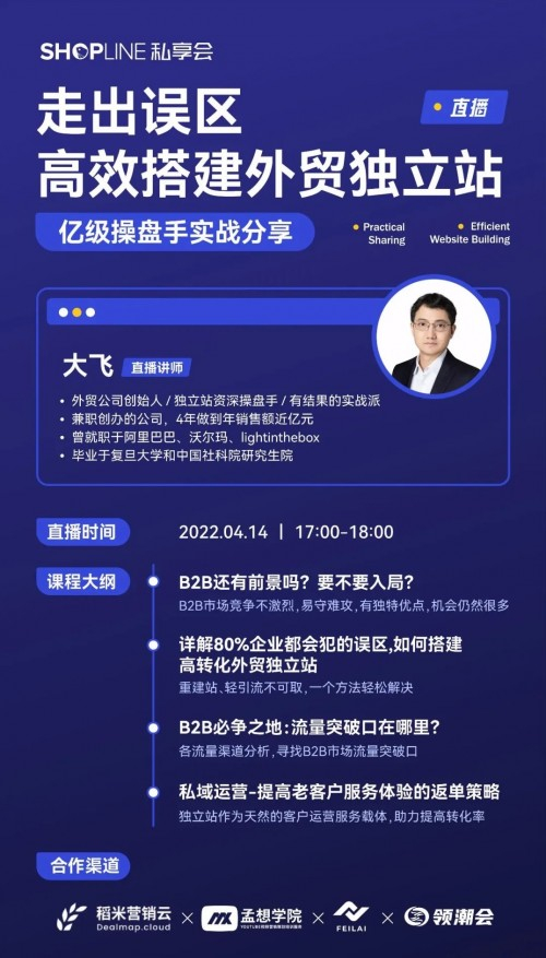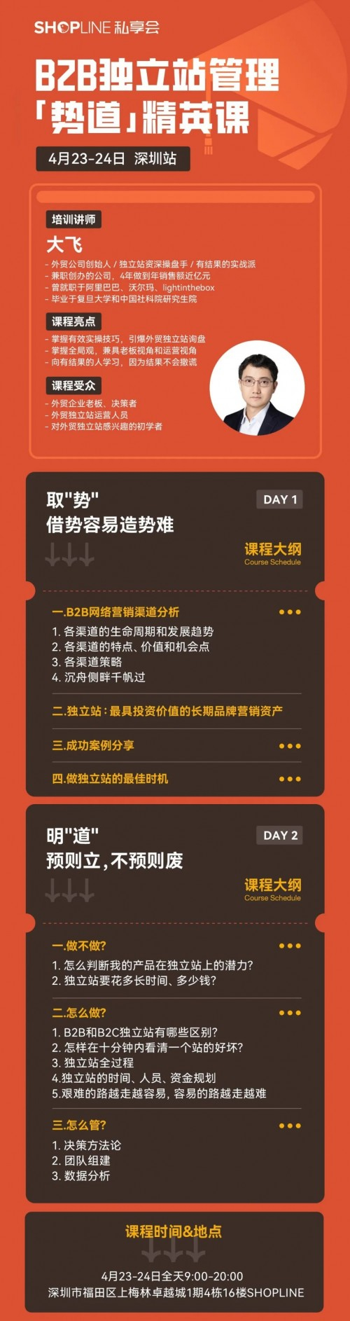 4月的课程,SHOPLINE私享会携手独立站资深操盘手-大飞老师给大家带来《B2B独立站管理“势道术”班》,以全局的视角带你走进独立站的世界!