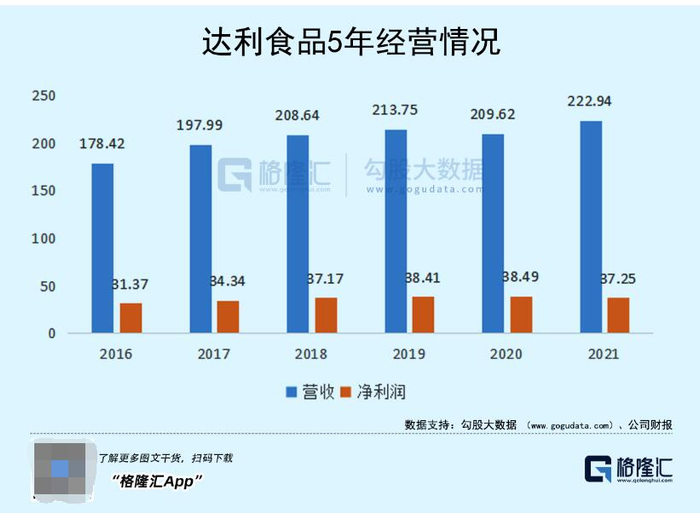 近日,达利食品发布了2021年财报,实现营收229.94亿,同比增长9.7%,规模再创历史新高。实现净利润37.25亿,同比微跌,基本持平,在全球原材料价如PET等价格大幅上升的压力之下,这算一个不错的表现。