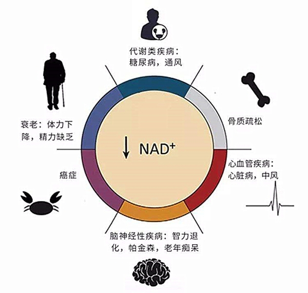缺乏NAD+会损害细胞产生能量的能力,导致老化和疾病,甚至是人类衰老的根本原因。体内的NAD+含量过低,会增加患心脏病、2型糖尿病、阿尔茨海默氏病及加速衰老的风险。
