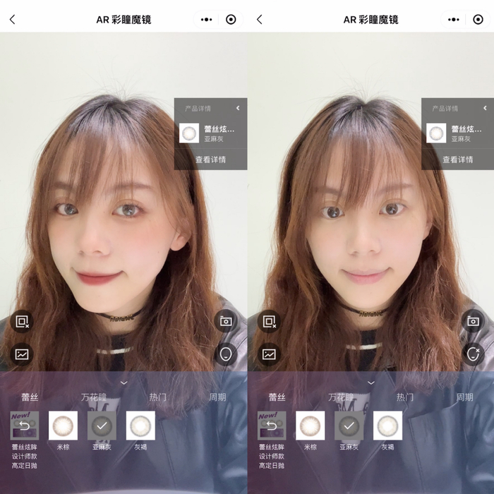 此前,美图魔镜与博士伦合作定制不同款式的彩瞳效果,在线下实体店内通过美图宜肤创新实验室(* Eve Research & Innovation Center,ERIC)、美图影像研究院(MT Lab)共同研发的人脸识别与AR虚拟匹配技术,为博士伦开发美瞳虚拟试戴体验,解决顾客门店选购前无法确认美瞳花色佩戴效果的售前痛点。