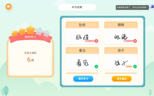 以AI听写背诵功能为例。小学阶段的学生有大量的听写、读背练习,需要家长在旁协助、监督。如果家长抽不出时间给孩子报听写、检查背诵,孩子的学习也会难以展开。而科大讯飞AI学习机A10创新性地以AI技术带领孩子做听写单词、背诵课文的功课,并能实时检查、反馈孩子错误情况。在AI的辅助下,孩子可以独立完成听写、朗读、背诵的练习并校对、改正,无形中也提高了自主学习能力。