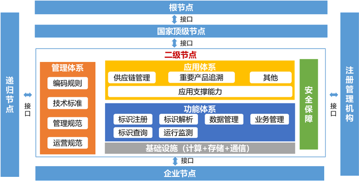 二级节点既要向上与国家顶级节点对接,又要向下为企业分配标识编码及提供标识注册、解析等服务,同时满足安全性、稳定性和扩展性等方面的要求。