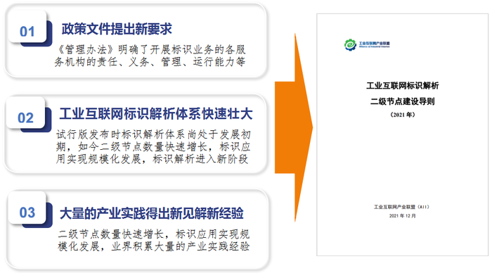 《工业互联网标识解析二级节点建设导则(试行版)》在2019年6月25日发布,其对工业互联网标识解析二级节点的体系架构、建设模式、运营要求等内容进行了明确规定,进一步规范了工业互联网标识解析二级节点的建设、运营和发展方向。在该导则发布的这两年中,标识解析体系快速发展,解析量、注册量均增长了几十倍,应用加速深化,技术体系也在逐渐完善。可见,试行版导则成功为二级节点在各地的快速推广和应用探索提供了理论基础和行动参照。