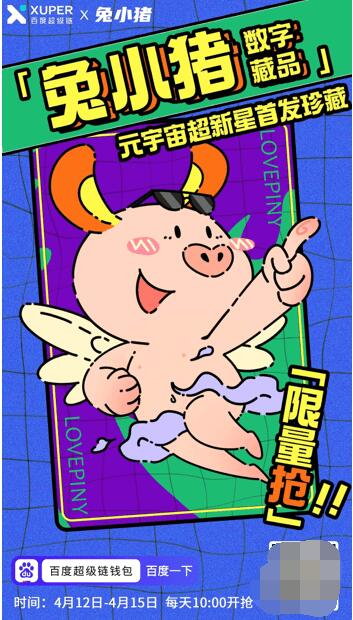 从4月12日起至15日,爱神、财神、福星以及佛祖等四种不同形象的兔小猪将轮番登场。届时,用户通过百度APP搜索数字藏品、百度数字藏品、百度超级链数字藏品、百度超级链钱包,进入相关小程序,将有机会领取限定兔小猪数字藏品。