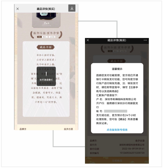考虑到金沙古酒数字藏品首发数量多、前期购买用户过多、且直接在线购买支付极容易引发支付安全等问题, 因此中青宝旗下的“稀元”平台采用了第三方平台直接支付与银行卡实名支付方式同时进行售卖。