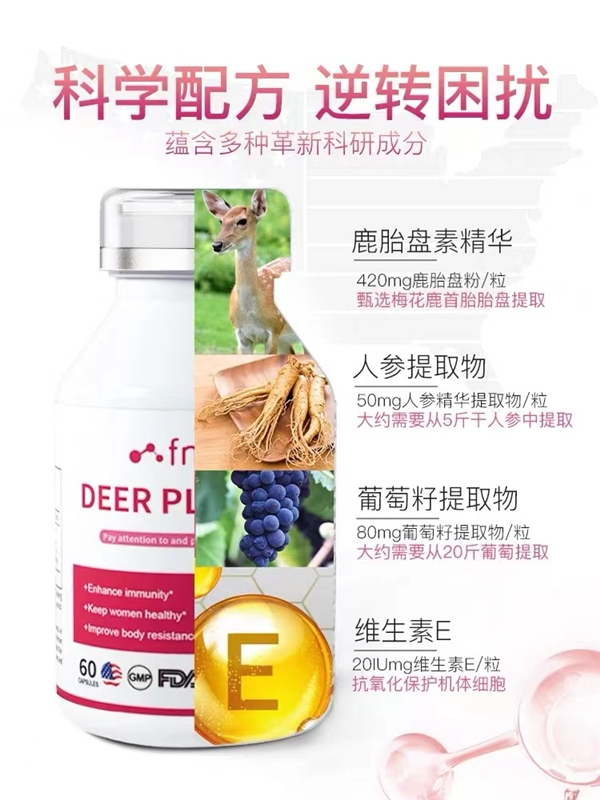 FMUKE鹿胎素胶囊优质而丰富的原材料产自美国,并具有FDA认证。FMUKE鹿胎素严选新西兰天然牧场自然放养的优质鹿胎,采用SPME细胞萃取工艺,12道工序活体提纯,吸收好、含量高纯。