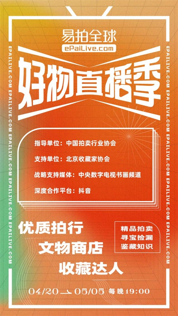 由世界古董艺术品在线交易平台——易拍全球发起并主办,中国拍卖行业协会指导,北京收藏家协会支持,中央数字电视书画频道为战略支持媒体,全球文物艺术品经营机构共同参与的大型文物艺术品综合网络活动“易拍全球好物直播季”将于2022年4月20日启幕,目前,各地拍卖行、全国文物商店等艺术机构,各界收藏达人踊跃开通直播间。本次“易拍全球好物直播季”活动将在易拍全球App、艺术品经营机构自主小程序或app同步开展,其中大多数直播将集中于4月20日-5月5日每晚19:00后开场。
