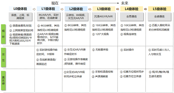 白皮书针对典型的家庭业务进行了梳理分析,围绕导向性、发展性和实现性三个原则提出了L0-L5六个级别的家宽业务体验分级建议,通过一系列的体验指标,在一定程度上量化用户的主观体验感受,推动各级业务体验不断向纵深发展。L0~L1级:视听方面,迈向更高的视觉分辨、无差别的画面和无损伤的声音要求;L2~L3级:业务体验将朝着其他横向的维度发展,业务交互维度的要求也越来越高,用户逐步参与到具体的业务当中;L4~L5级:当未来进入全息全感通信时代,体验的真实感将消弭数字世界和物理环境的差异,让用户在融合的全新世界中畅游。如下为L0-L5级业务体验总结: