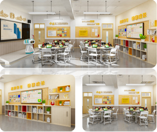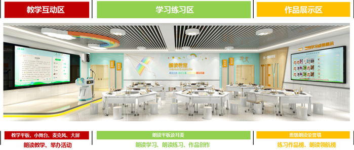 教学区以小舞台、教学大屏等智能设备,辅助语文教学、背诵、测评或特色课程等;学习区以朗读平板为载体,实现听说读、AI测评、趣味配音、名家示范等教学功能;展示区实时展示学生的优秀学习成果,形成班级文化墙。