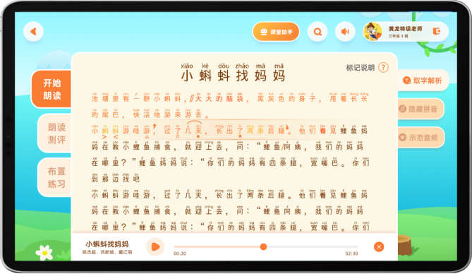 而在提升语文教师的教学效率上,朗读教室“导、学、练、评、演”的系统教学法,让语文老师能够专业、高效、轻松地完成朗读教学任务,最后还能生成数据报告,方便深入了解每个学生的朗读学习情况。