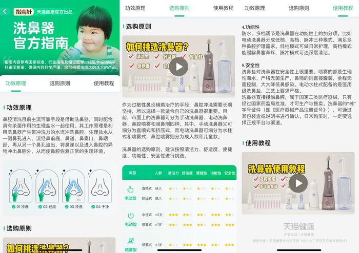 “指南针是天猫健康官方出品的专业指南,指南内容参考国家标准、行业指南及循证医学,经医学编辑编审、科审团复审,确保内容科学严谨,消费者可根据指南选购适合自身及需求的产品。洗鼻器是该指南首个覆盖的品类。后续我们还会有隐形眼镜、维生素、祛疤膏、盆底康复仪等品类的指南,满足不同类型用户的需求。”天猫健康总经理云骢表示,目前网络上有各种博主、消费者分享商品内容和选购攻略,但健康类商品对专业和规范的要求度比较高,专业指南的推出也可以给想要了解、分享健康产品科普内容的用户一个参考。