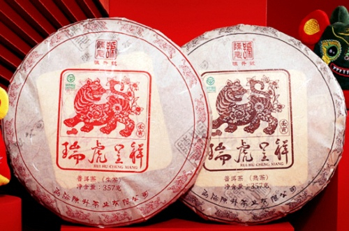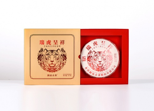 从2003年开始澜沧古茶就开始推出生肖饼,此后陆续出品。澜沧古茶虎年生肖饼命名为“瑞虎呈祥”,是一款熟茶。“瑞虎呈祥”精选澜沧江流域茶山中的大叶种乔木老树、调入古树茶为原料,经半个多世纪纯熟传统技艺制作,经适度发酵、高温蒸压而成。