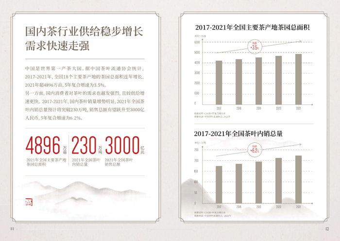中国是世界第一产茶大国。中国茶叶流通协会统计,2017-2021年,全国18个主要茶产地的茶园总面积连年增长,5年复合增速为3.5%;同期,国内茶叶销量增势明显,2021年全国茶叶内销总量预计将突破230万吨,销售总额有望跃升至3000亿人民币,5年复合增速为6.2%。