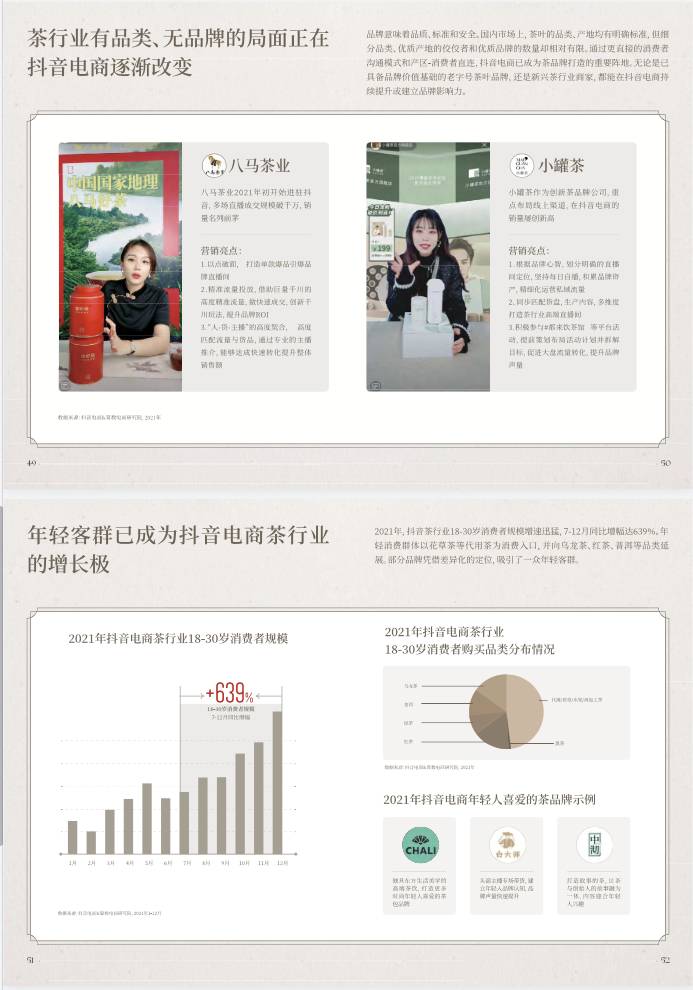 • 年轻客群已成为抖音电商茶行业的增长极。2021年,抖音茶行业18-30岁消费者规模增速迅猛,年轻消费群体以花草茶等代用茶为消费入口,并向乌龙茶、红茶、普洱等品类延展。部分品牌凭借差异化的定位,吸引了一众年轻拥趸。