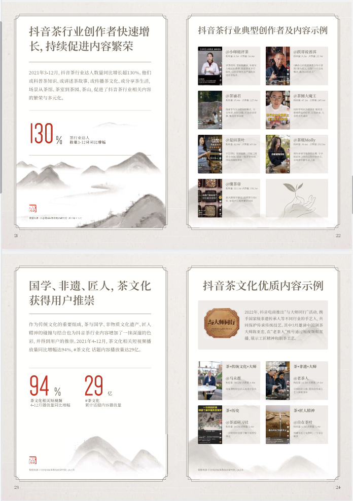 我们希望通过本篇报告,能为茶行业商家、产业带、创作者等主要生态参与者和消费者扼要呈现抖音茶行业的发展情况,提供部分参考的同时,也见证并记录抖音电商在促进我国茶行业蓬勃发展中的跬步。