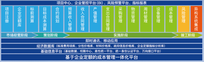 此种形势下,显而易见对于建筑企业而言,建立自己的企业标准定额已经到了必须纳入日程的阶段了。很多走在前面的企业其实在新政出台前就已经有这方面历史积累的,这其中最为典型的就是一些大型央国企、省级建投企业率先携手业界信息化厂商探索出的一套“基于企业定额的成本管理一体化”方案,真正的做到了基于企业定额的标准基础,去做全链路的企业成本管控。