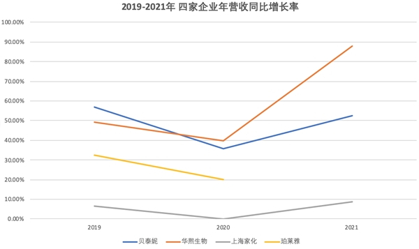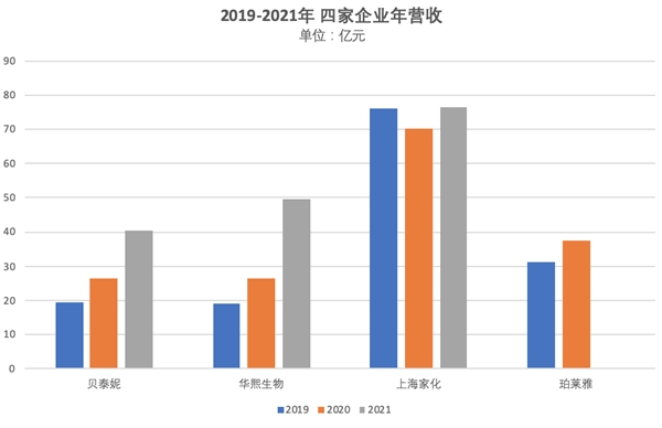 从近几年的市场表现来看,一批营收高增长的头部本土企业进入大众视野。包括贝泰妮、华熙生物、上海家化、珀莱雅等,也正是现阶段护肤品市场的主力军。