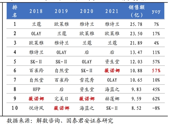 贝泰妮以薇诺娜为核心,重点针对敏感性肌肤,向消费者提供符合不同皮肤特性需求的专业型化妆品。数据显示,薇诺娜2021年至少卖出了39.41亿元,在“皮肤学级护肤品”国内市场排名稳居第一,其中爽肤水市场和面膜市场排名持续提升。薇诺娜已经连续四年进了护肤品双十一榜单,是唯一进榜的国货品牌,并且去年排名进一步提升至第六,可见其品牌影响力。