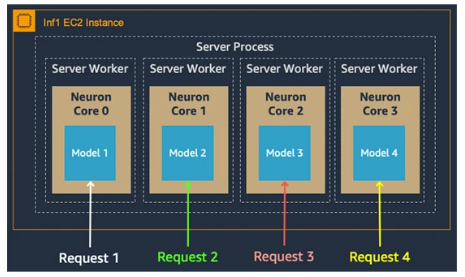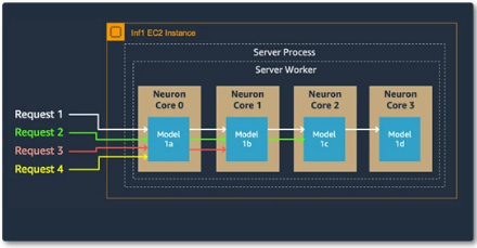多核上的模型并行性还提高了吞吐量和延迟,这对于我们繁重的工作负载至关重要。每个 Inferentia 芯片包含四个 NeuronCore,它们既可以同时运行单独的模型,也可以形成流水线来传输单个模型。在我们的用例中,数据并行配置以最低的成本提供最高的吞吐量,因为它扩展了并发处理请求。