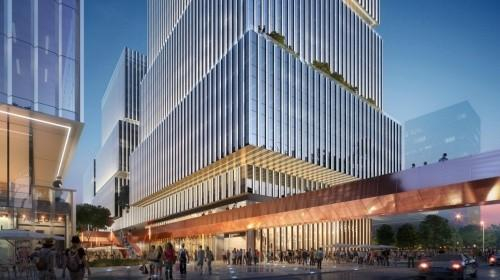 这套公共连廊步行系统在纵向上分为三层。地下一层、二层接轨城市轨道交通的出入口,人们从地铁出站口,可以直接到达室外下沉庭院休闲中心,亦或是直接抵达办公空间。