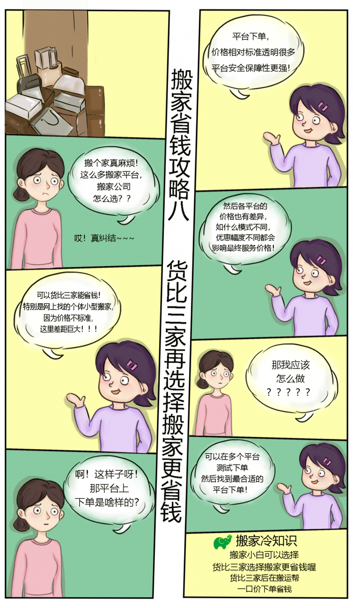 当搬家时,建议货比三家能省钱!特别是网上找的个体、小型搬家,因为价格不标准不透明这里差距较大!一定要对比三家再确认选择服务;如果是选择平台下单,平台价格相对标准透明很多,平台安全保障性更强!但是各平台价格也有差异,如计费模式不同、优惠幅度不同都会影响到最终服务的价格,也建议先在多个平台测试下单,然后找到最适合自己的平台下单。