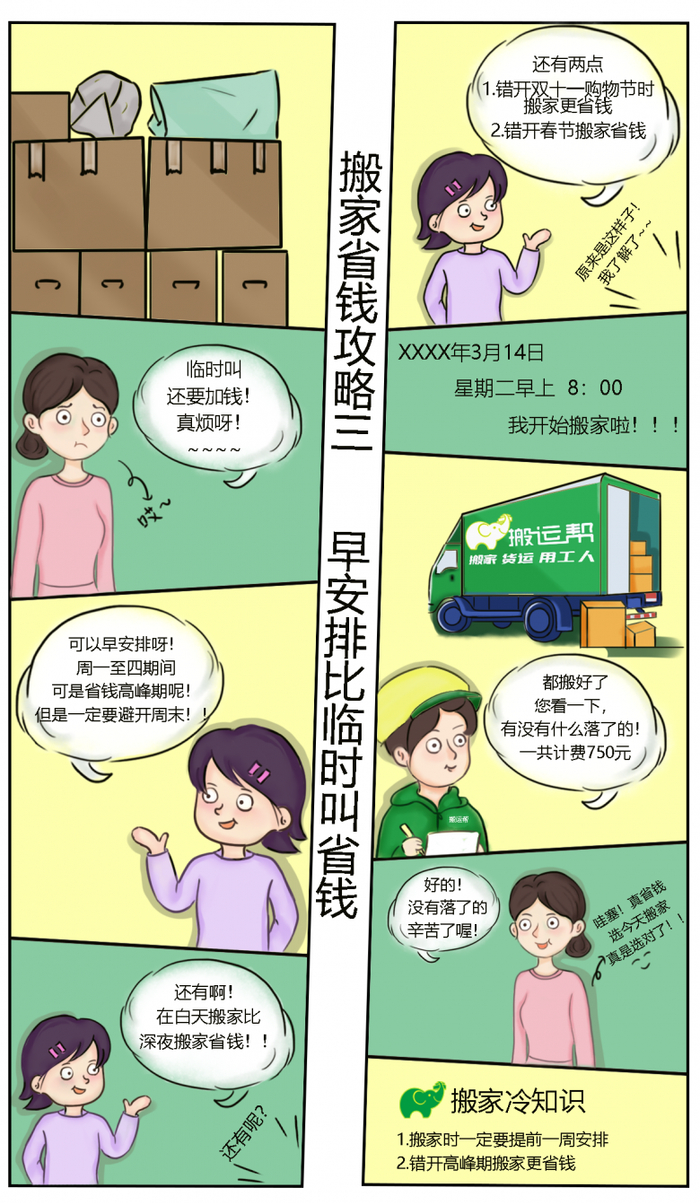 选工作日搬家比周六日搬家省钱!因为周六日为搬家高峰,大多集中在周六日搬家,搬家从业人员周末基本排满,反而是周一到周五工作日搬家业务少,从而议价空间大!工作日白天搬家费用能省15%