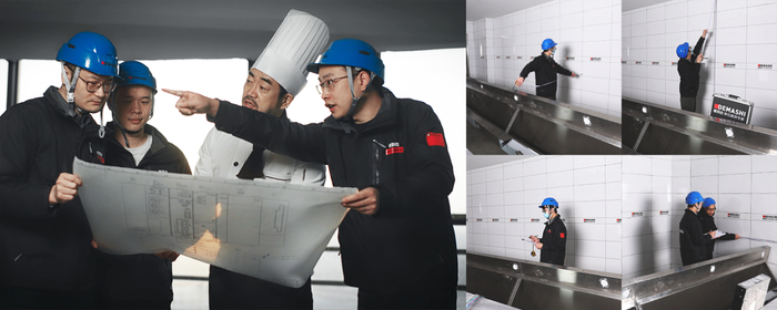 1、全国免费上门测量——工程团队免费上门测量定尺寸, 资深大厨布局设计,让单位厨房更好用。