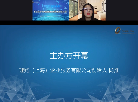 活动伊始,理购(上海)企业服务有限公司创始合伙人杨雅女士对本场直播进行了开场致辞,她首先对本次活动的所有分享嘉宾表示衷心的感谢,对直播间收听的各行各业的法务同行们表示热烈的欢迎。杨总在致辞中提到,本次峰会将聚焦于不同行业、不同领域面对数字化将呈现的不同状态,包括组织架构变革、管理流程重塑、数字化路径设计,运用信息技术,推进风控、内控、合规向价值增值型转型。