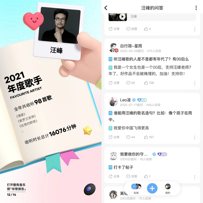 也正是因为有这样的独特风格,才让汪峰受到了更多人的喜欢。在酷狗音乐上,打开汪峰主页,在关于歌手的问答板块,可以看到诸多歌迷与歌曲本身的深入互动,这其中,有人晒出了自己在酷狗的2021年听歌报告,显示汪峰就是其年度歌手;也有人提问“是否有00后还在听汪峰的歌”诸多00后歌迷纷纷回复响应,“03年路过”、“09到达”、“04报道”……可见,好的音乐,从不被时间冷待。