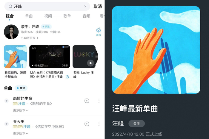 4月13日,汪峰发文表示,新专辑下一首单曲将在4月18日12:00发布,并称新歌发布后,很快就会出完整的专辑。他表示这一专辑是由几代音乐人共同制作完成,可谓凝结心血之作。酷狗音乐上线汪峰新歌预约页面,与网友们一起期待4月18日的新歌首发。