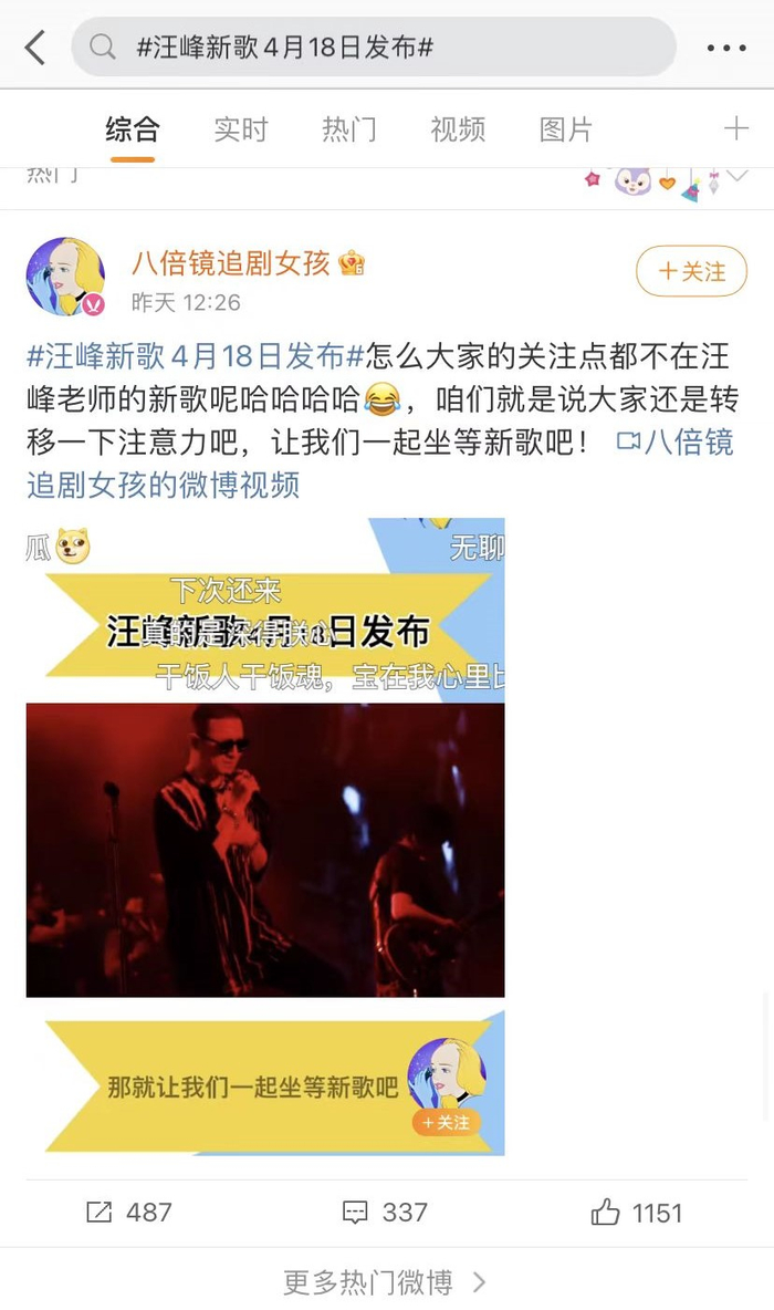 但“汪峰要发新歌”这一消息传出后,却引来了很多网友在线等瓜,毕竟此前汪峰新歌发布,娱乐圈一般都会有更爆炸的事件发生,网友也将汪峰和热搜之间的微妙关系,当成一个梗,甚至专门为此发明了“汪峰定律”一词。