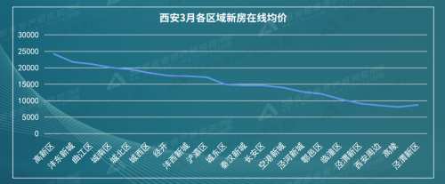 在房价表现上,58同城、安居客统计显示,截至3月底,西安新房在线均价为15213元/㎡。一季度秦汉新城、沣西新城、城北等区域的房价均有不同程度上涨。其中秦汉新城上涨明显,一季度上涨833元/㎡,涨幅为6.02%。具体到房价上,高新区、曲江区、沣东新城、城南区4个区域的3月新房在线均价超过2万元。其中,高新区以24212元/㎡的价格位列西安各区域榜首。
