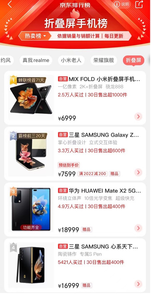 排在榜单第一位的是小米MIX FOLD,搭载了骁龙888处理器,6.52英寸的外屏,展开后8.01英寸AMOLED2K+大屏,分辨率从720P提升至1440P,harman/kardon立体声四扬声器,5020mAh大电量双电池。小米MIX FOLD后摄像头高达一亿像素,侧面有符合人体工学设计的弧形指纹解锁,京东焕新季期间,下单享24期免息。三星 Galaxy Z Flip3搭载了骁龙888处理器,掌心折叠的外观设计,折叠后的尺寸相当于普通直板手机的一半,轻薄美观、身形小巧的“掌上机”成为了不少时尚弄潮儿的潮流单品,位列榜单第2位,在京东购买的用户还可选择全额保值换新、24期免息等版本。