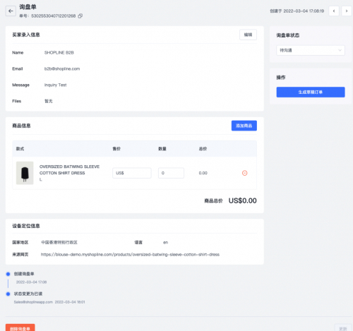 当客户发起询盘,就意味订单已经成交了一半。为了帮助B2B卖家更好地跟进询盘,最终顺利促成订单成交,SHOPLINE推出了智能询盘功能。