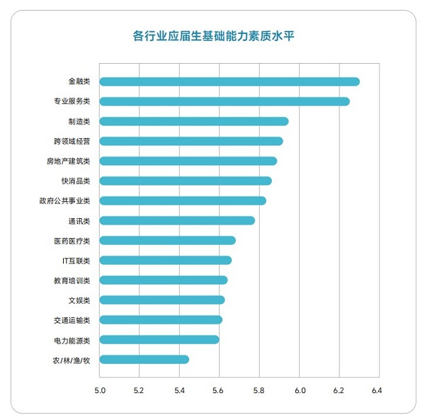 从各行业中的毕业生基础能力素质水平表现上来看,金融类行业的水平最高。这源于金融业对于高学历人才的需求上升,越来越看重“高精尖”人才。据智联平台校招企业的数据显示,金融业对于硕博士的需求增长率达318%,对于人才的专业技能要求更高。