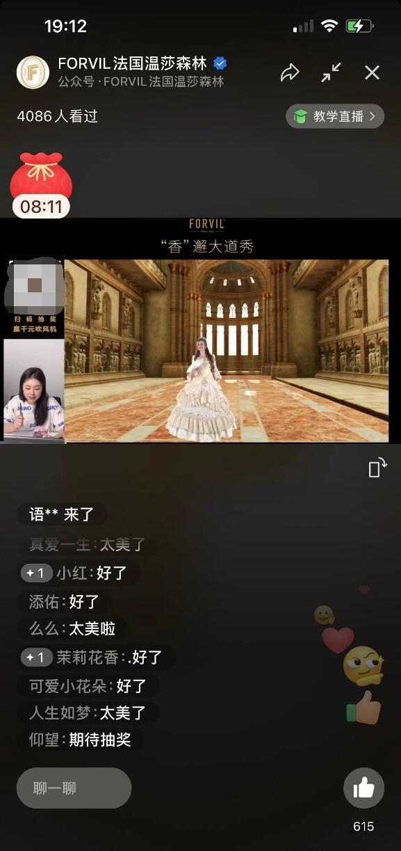 同时,4月12日FORVIL抖音官方直播间,4月13日FORVIL官方微信视频号3大平台首次联动直播,同步上演“香”邂大道秀。抖音官方直播间,借助4大法式场景绿幕画面,外模站在跑步机上创意模拟走秀场景,人均观看时长8分多钟,远超平台平均观看时长。官方微信视频号重磅首播,直播间不仅上演VR沉浸式看秀,还同步揭秘虚拟3D影像技术的秘密,引起了腾讯视频号个护行业的官方关注。