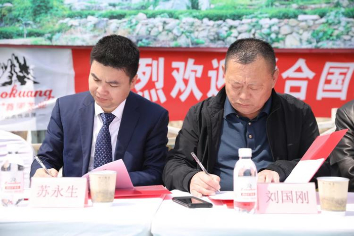 发布会现场,崂矿尊圃茶业董事苏永生先生与王哥庄街道长岭社区党支部刘国刚书记签订战略合作协议。