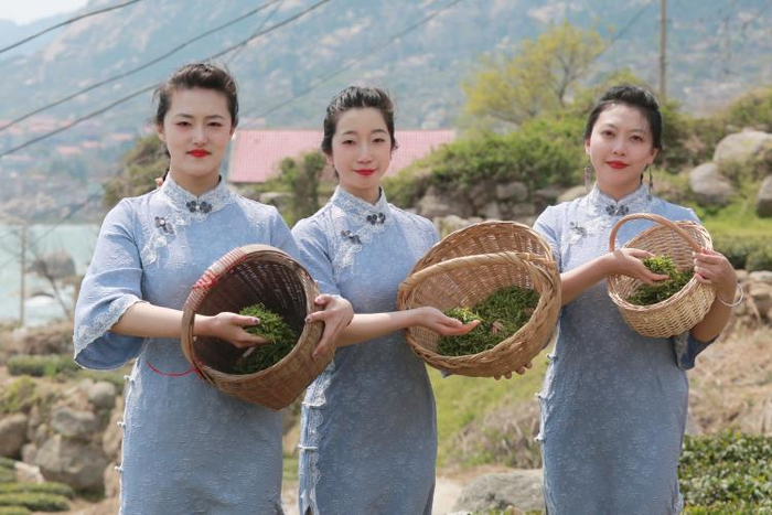 崂矿尊圃茶业的茶仙子们,现场用崂山山泉水浇灌茶树并采摘头春茶鲜叶摊晾,由首席制茶大师现场炒制。从茶青到成茶,炒茶师傅凭借多年崂山传统茶炒制经验,与铁锅的温度协作配合,在妙手翻覆之间酿出阵阵茶香。每一道工序都亲身示范讲解,让现场嘉宾对崂山传统茶的精细制作工艺有了新的认识。配合着茶仙子的茶艺表演等节目,为现场的嘉宾完美展现了一场传统的崂山茶文化技艺表演。