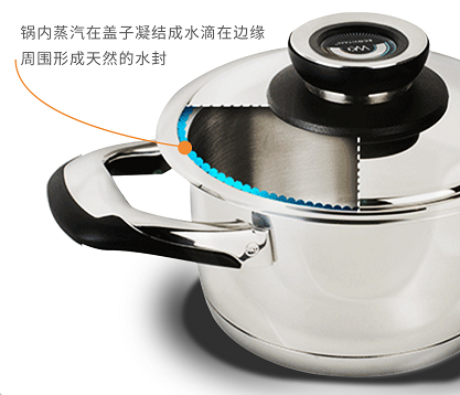 不管对于什么样的锅具来说,锅盖的密封性能越好,蒸煮出来的食物的味道就会越好。通常普遍家里用的不锈钢锅的的盖子的密封性很差,一般盖的不严实,从而会导致煲汤、煮出来的食物的不太好吃,水分容易干。这款WK不锈钢锅拥有独特的凹槽设计,比一般的锅的凹槽设计的都要深一点,边缘的密封性很好,保证出气的同时还能减少锅内水分的流失,更好锁住营养,煲出来的汤更加鲜美。