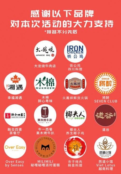 市子烤肉·韩食料理/将醉SEVEN CLUB/芭道小馆Viet Lotus越南料理/幸福湘遇/大龙烧牛肉店/道谷/铁公鸡·四川料理/Over Easy by Senses /牛一西餐果木烤牛扒/木棉·醉心粤味/火鳳祥鲜货火锅/融合四喜茶餐厅/椰夫人·养生椰子鸡/MILIMILI秘哩秘哩派对蛋糕