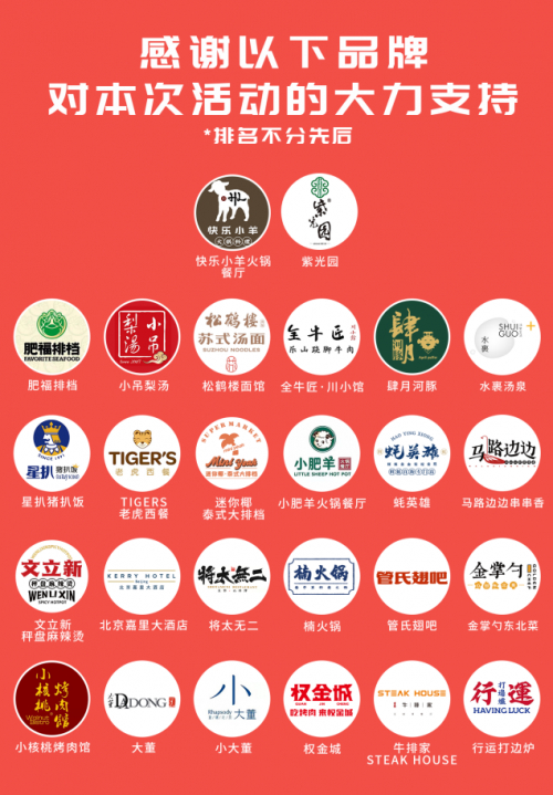 快乐小羊火锅餐厅/牛排家STEAK HOUSE/紫光园/行运打边炉/肥福排档/水裹汤泉/松鹤楼面馆/全牛匠·川小馆/肆月河豚/蚝英雄/小吊梨汤/星扒猪扒饭/TIGERS老虎西餐/迷你椰·泰式大排档/小肥羊火锅餐厅/将太无二/马路边边串串香/文立新·秤盘麻辣烫/楠火锅/北京嘉里大酒店/管氏翅吧/金掌勺东北菜/小核桃烤肉馆/大董/小大董/权金城