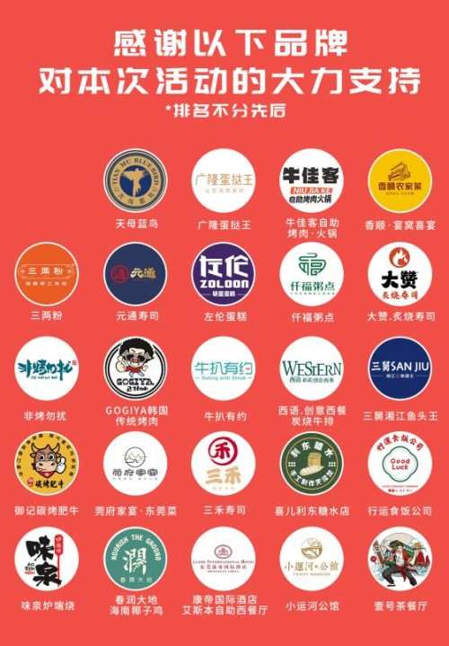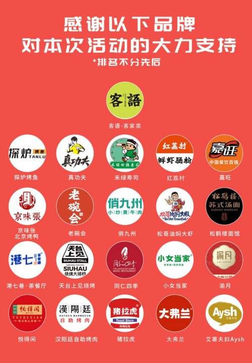 客语·客家菜/松哥油焖大虾/小女当家/渝月/悦得闲/红荔村/俏九州/京味张·北京烤鸭/嘉旺/探炉烤鱼/老碗会/天台上见烧烤/汉阳廷自助烤肉/禾绿寿司/艾薯夫妇Aysh/猪拉虎/同仁四季/真功夫/港七巷·茶餐厅/松鹤楼面馆/大弗兰