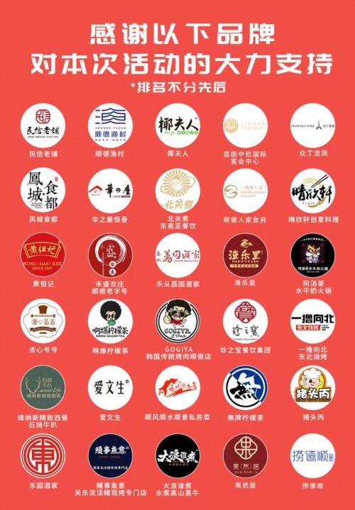 凤城食都//果然居/捞德顺/华之屋恒香/鳗事鱼意·关东流活鳗现烤专门店/晴欣轩创意料理/無牌柠檬茶/浓心爷爷/北关煮•东南亚餐饮/民信老铺/顺德渔村/椰夫人/荔园中欧国际宴会中心/众丁龙凤/顺德人家食府/禾盛农庄·顺德老字号/乐从荔园酒家/黄但记/渔乐里