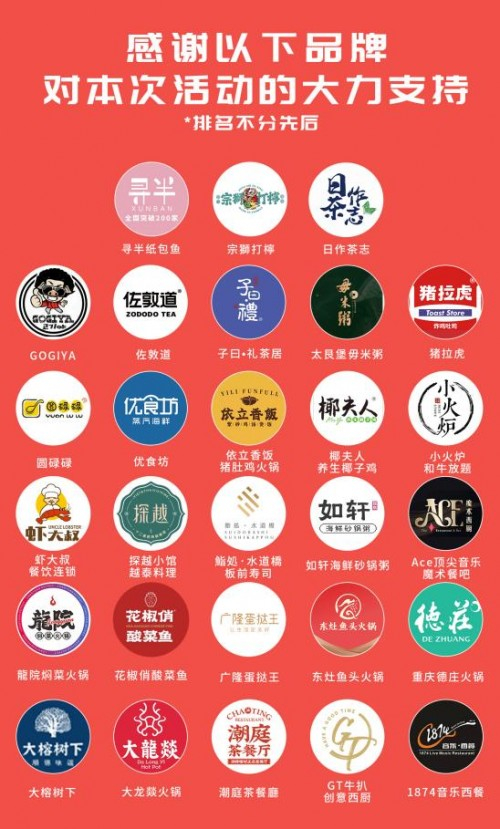 黑眼熊/大兵小将/码头故事/冒椒火辣/秋金小炒/竹链烧肉/李不管把把烧/朱光玉火锅/叁口煮/老钟家/后火锅/舌尖派对/袁记串串/爸爸炒料/自留田西北菜/北木南烤肉和酒/蚝英雄/正禾鲜/凉山好汉自助西昌烤肉/香佰里火锅/班花麻辣烫/一把骨/藏炭烧肉屋