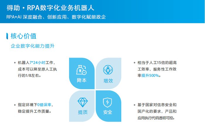 目前,得助RPA企业数字化能力平台已在政务、金融、制造、能源、电信、物流、零售 等多个行业的财务(共享)中心、风险内控、日常业务办理、用户体验优化、私域运营等业务场景实现落地,累计赋能超五十家行业头部企业和政府机构,加速数字化转型升级。