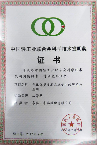 就拿喜临门空气弹簧技术来说,相较于使用了几十年的钢铁弹簧技术,具有软硬可调节特性的气体弹簧可以更好地适应用户的脊柱曲线,通过精准的匹配能力帮助消费者“养成”自己的专属床垫。喜临门也凭借着这项“气体弹簧及其在床垫中的研究与应用”,获得了部级科技发明二等奖。